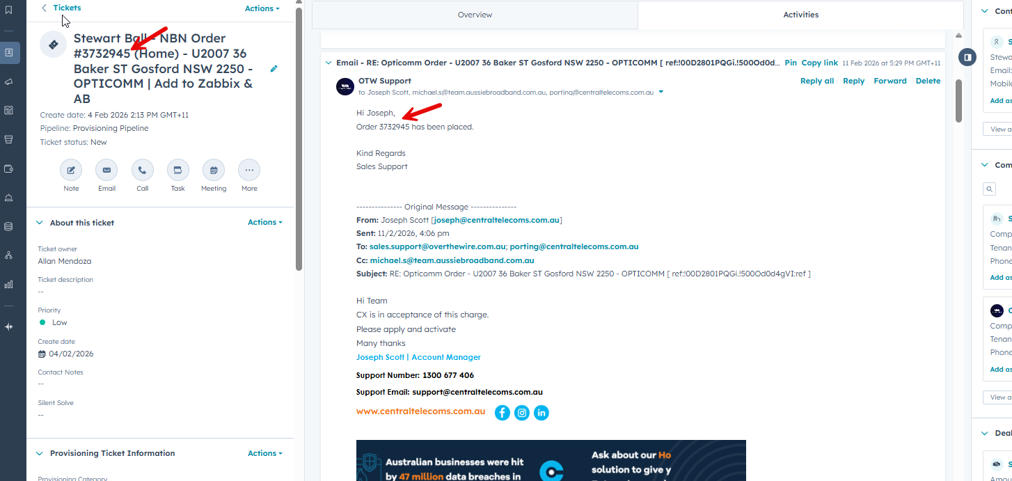 Create the order via HubSpot or send email to sales.support@overthewire.com.au