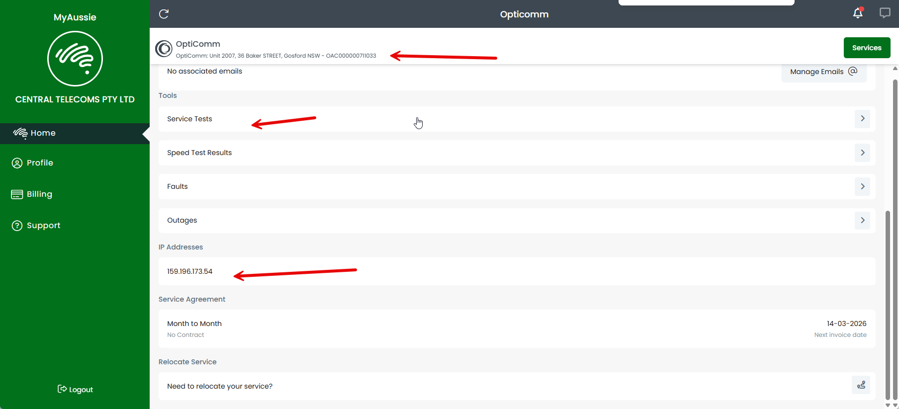 Once activated, confirm the service appears in the MyAussie portal and run a Test