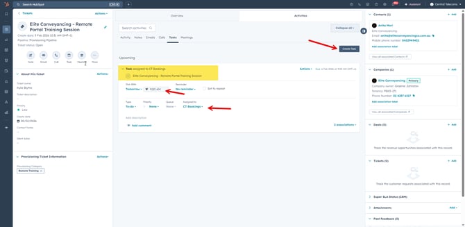 Create a task in HubSpot linked to the ticket.